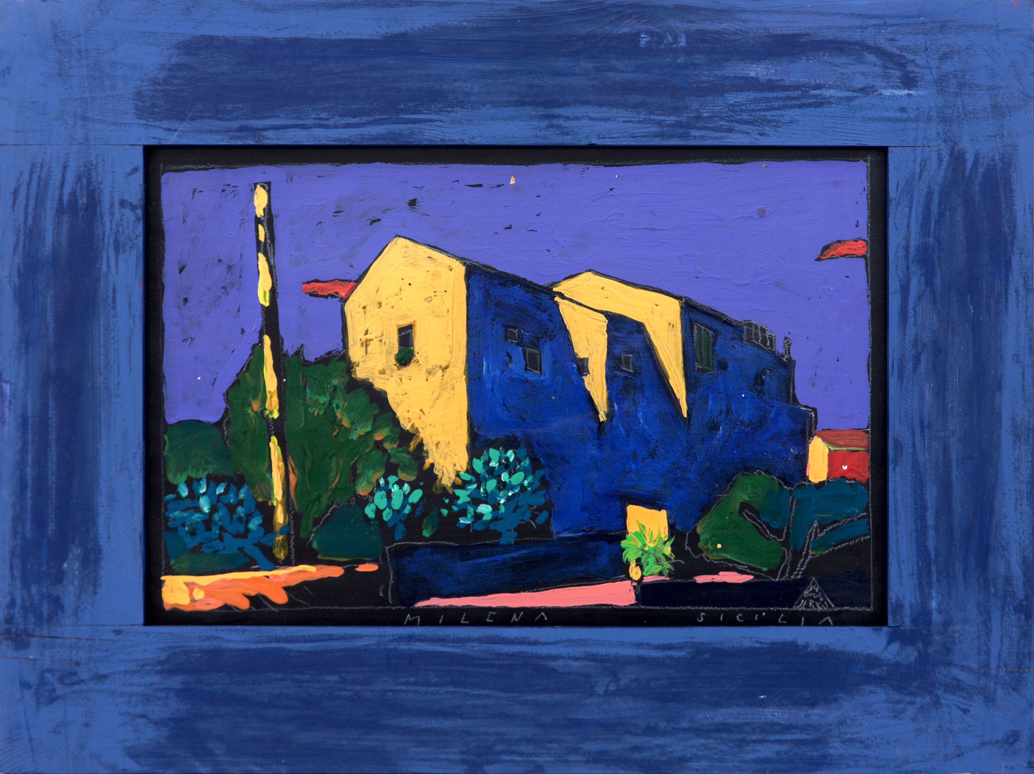 olej, křída, deska, 2014, 33,5 x 51 cm, sign. PD Boris Jirků, rám, expresivní malba Borise Jirků, českého malíře, grafika a ilustrátora, jehož tvorbu charakterizuje sytá barevnost a temperamentní rukopis. Obraz zachycuje středomořskou architekturu v kontrastu hlubokých modrých a žlutých tónů, doplně…