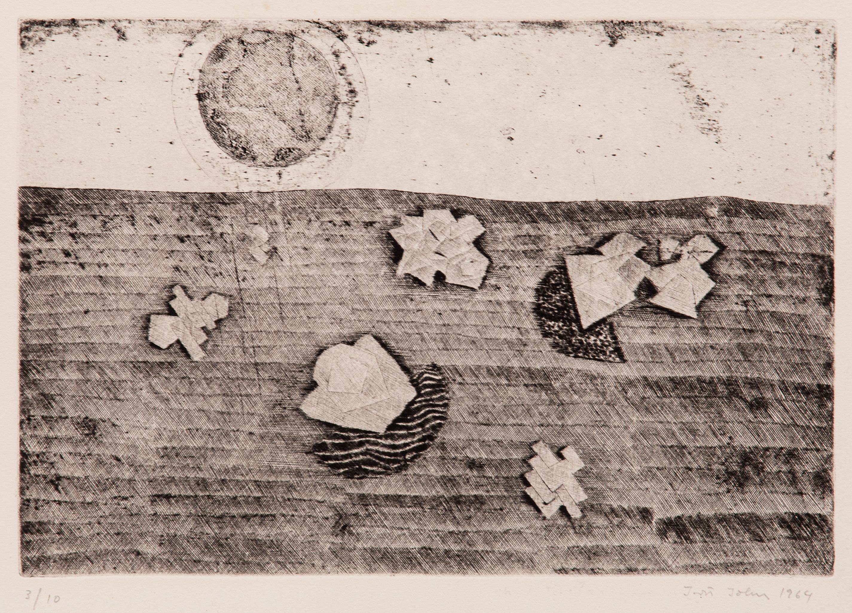 suchá jehla, 1964, 19,8 x 29,2 cm, sign. PD Jiří John 1964, č. 3/10, tento grafický list s nákladem pouhých 10 kusů je dílem klasika umění šedesátých let 20. století, který za své vynikající grafiky získal mnoho mezinárodních cen a je jimi zastoupen v nejprestižnějších světových sbírkách jako jsou n…