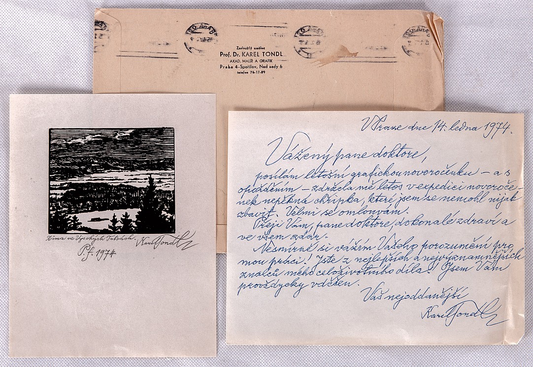 dopis, 1974, 16,7 x 21 cm, Rukopisný dopis s podpisem ze 14.ledna 1974, v původní obálce s razítkem autora. Jako novoročenka přiložen sign. dřevoryt Zima ve Vysokých Tatrách ve formátu 7,6 x 9 cm., Provenance: Antiquarian Dlážděná, the disciple of prof. J. Loukota, V. Bukovac, J. Preisler and M. Sva…