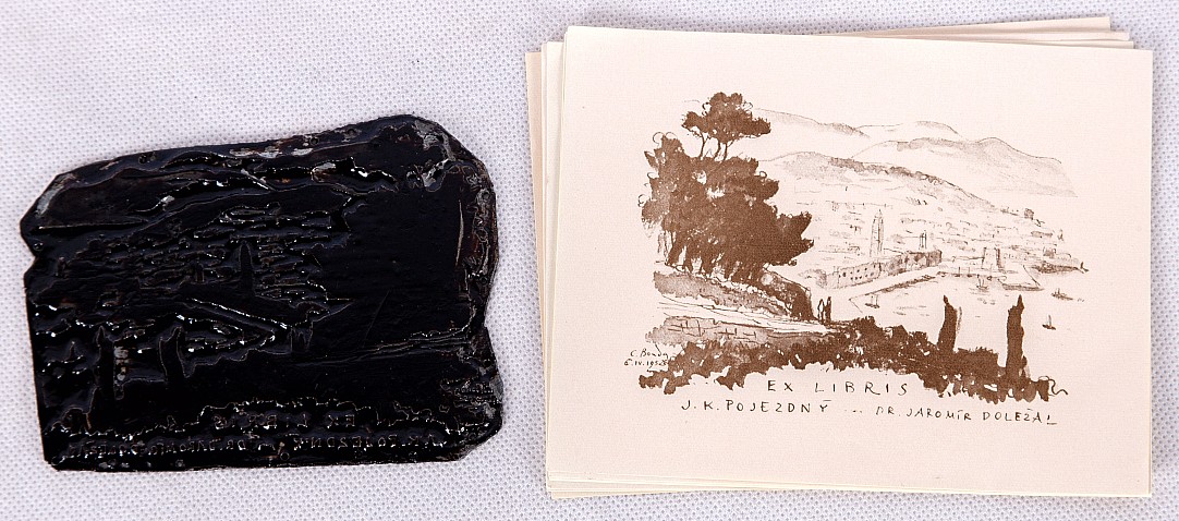štoček a 12x ex libris, 1952, 8,5 x 11,5 cm, značeno LD v desce C. Bouda 6. IV. 1952, kovová grafická deska pro tisk ex libris Dr. Jaromíru Doležalovi (pseudonym J. K. Pojezdný), přiloženo 12 ex libris pořízených z desky, Provenance: Antiquarian Dlážděná, the disciple of V. Kysela and M. Svabinsky, …