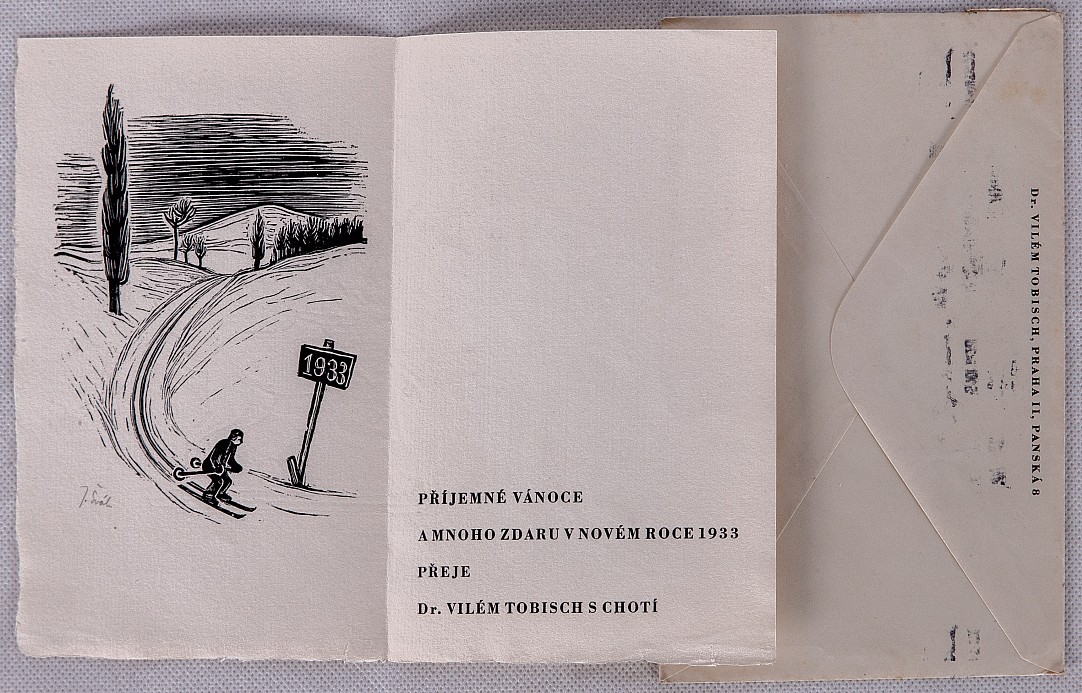 dopis, 1932, 17 x 21,7 cm, sign. LD J. Šváb, Vánoční přání a PF 1933 s užitím dřevorytové novoročenky na ručním papíře od Jaroslava Švába. Praha 23.XII.1932, v původní obálce. JUDr., národohospodář, rada českého zemského výboru v Praze, prozaik., Provenance: Antiquarian Dlážděná