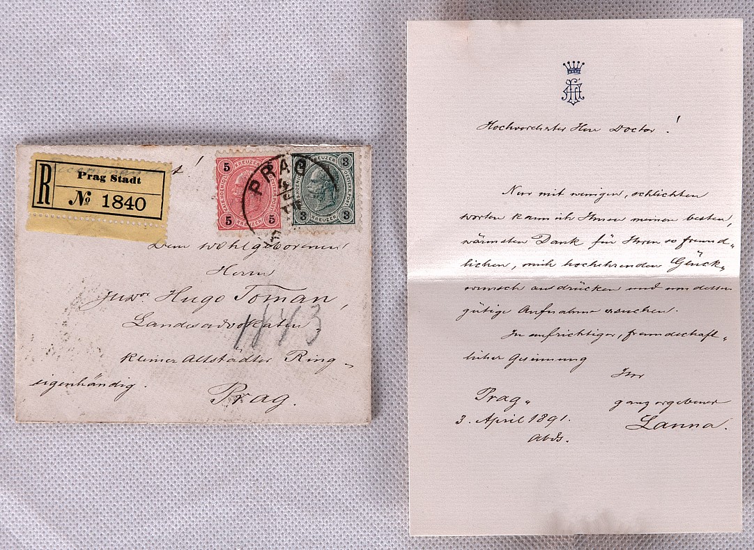 dopis, 1891, 15,5 x 20 cm, Rukopisný signovaný dopis v němčině ze 3. dubna 1891, v původní obálce s razítkem pisatele, mecenáše, podnikatele, bibliofila a sběratel umění. Adresátem je Hugo Toman (1838-1898), právník, historik, znalec výtvarného umění, otec Prokopa Tomana st., Provenance: Antiquarian…