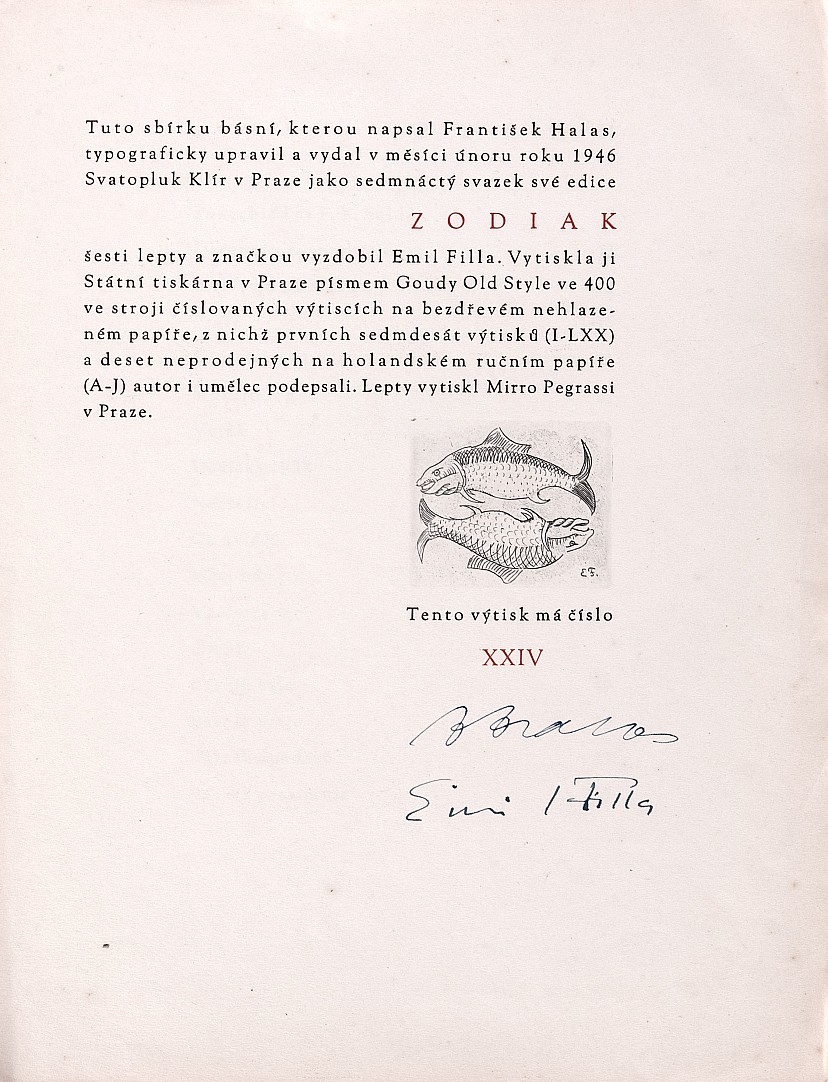 volný list, 32 x 24 cm, podpis E. Filla a F. Halas ve volné tiráži bibliofilie Torso naděje, tiráž obsahuje drobný autorův lept, volný list, dobrý stav, Provenance: Antiquarian Dlážděná, the disciple of prof. Thiele and Bukovac at The Academy of Fine Arts in Prague, member of The Manes Association o…