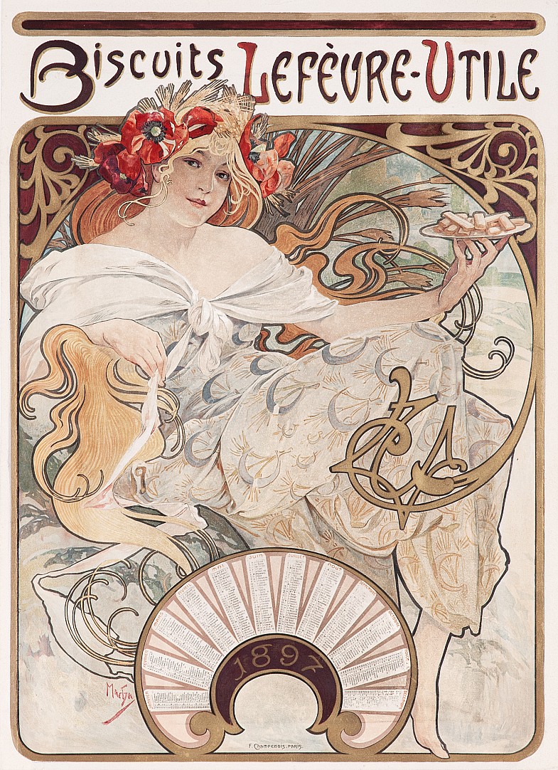 litografie, 1896, 62 x 45,5 cm, rám, Tento plakát představuje jeden z Muchových nejosobitějších portrétů. Mladá žena s dlouhými vlnitými vlasy, jejíž hlava je zdobena pšenicí a vlčími máky, nabízí na podnosu sušenky francouzské značky Lefevre – Utile. Autor byl významný český malíř a designér obdob…