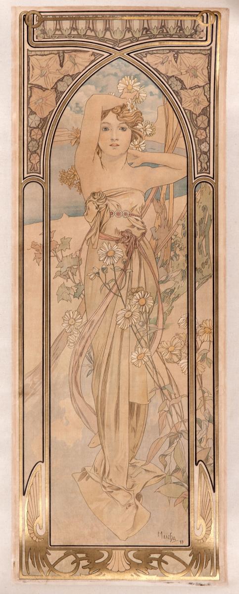 litografie, nalepeno na plátně, 1899, 103,5 x 38 cm, sign. v tisku PD Mucha, z cyklu Denních dob, autor byl významný český malíř a designér období secese, jeden z nejproslulejších českých umělců světového významu. Působil v Paříži, kde se proslavil především svou plakátovou tvorbou pro Sarah Bernhar…