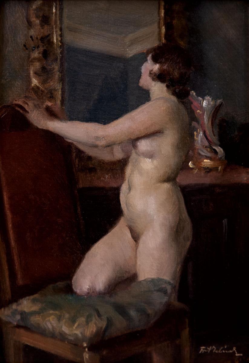 olej, deska, 35 x 24,5 cm, sign. PD Fr. A. Jelínek, rám, intimní interiérová scéna zachycuje ženu před zrcadlem ve ztišeném, soustředěném momentu. Malba vyniká jemným koloritem, měkkým modelováním postavy a decentním světelným kontrastem, který podtrhuje klidnou atmosféru výjevu. Dílo nese znaky aut…