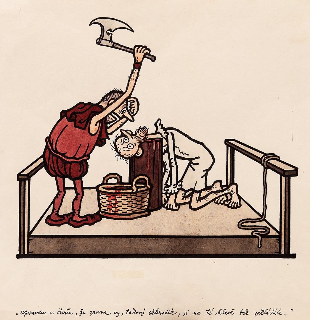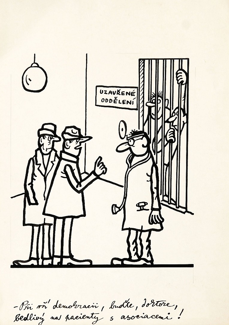 tuš, papír, 30 x 21 cm, kreslíř, karikaturista, ilustrátor a humorista. Jeden z autorů satirického časopisu Dikobraz. Za svůj život vytvořil více jak 35 000 kreslených vtipů s širokým záběrem témat, studied at The Secondary Technical School of Graphics in Prague and The Faculty of Science - Char…