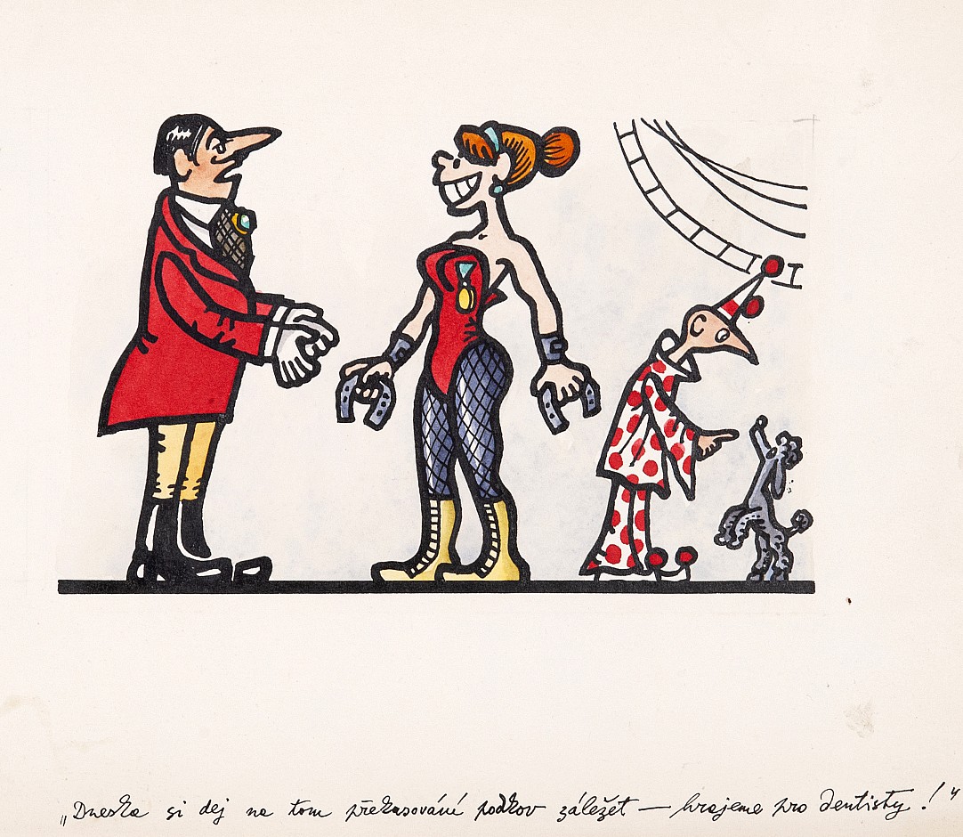 akvarel, tuš, papír, 22,5 x 29 cm, na zadní straně značeno autorským razítkem NEPRAKTA, dole text: Dneska si dej na tom překusování podkov záležet - hrajeme pro dentisty!, Provenance: Antiquarian Dlážděná, studied at The Secondary Technical School of Graphics in Prague and The Faculty of Science - C…