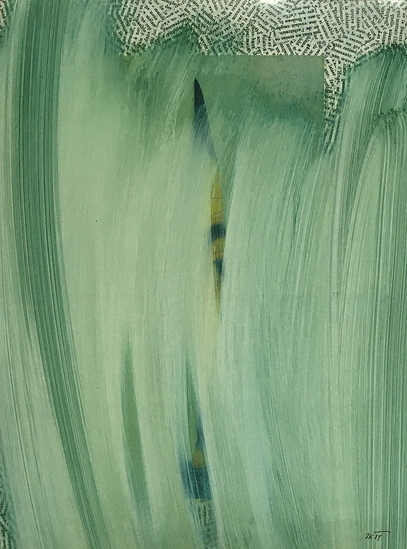 alchymáž, papír, 1989, 29,5 x 22,5 cm, PD monogr. JK 89, rám, po Ladislavu Novákovi si techniku alchymáže vyzkoušel také Jiří Kolář. Alchymáž je výtvarná interpretační technika, kdy umělec vymývá reprodukci chemickými rozpouštědly a vzniklý volný prostor naplní vlastním motivem. Autor takto často vy…