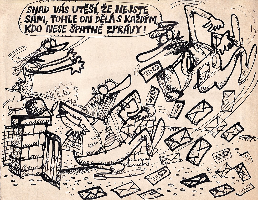 tuš, papír, 19 x 24,3 cm, Text: Snad vás utěší, že nejste sám, tohle on dělá s každým, kdo nese špatné zprávy!, na zadní straně technické poznámky z redakce, Provenance: Antiquarian Dlážděná