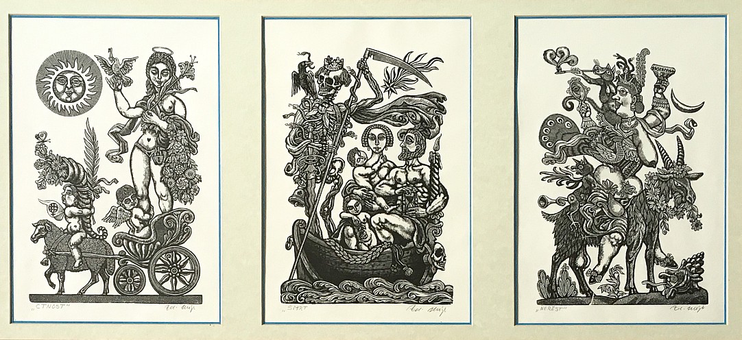 3x dřevoryt, vše 18,5 x 27,5 cm, vše sign. PD Zd. Mézl, rám, the disciple of prof. J. Vodrazka, V. Pukl, V. Silovsky and A. Tomov