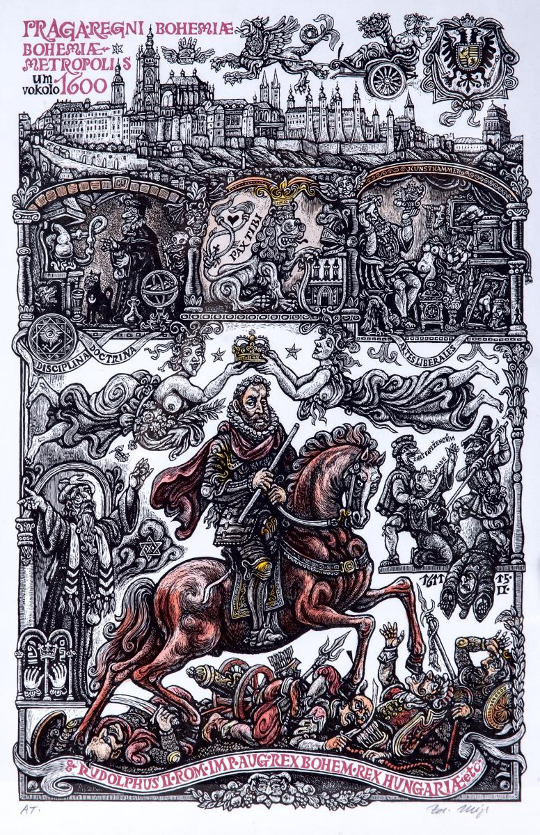 dřevoryt, 46 x 31 cm, sign. PD Zd. Mézl, rám, autorský tisk, detailně propracovaný dřevoryt zachycující Prahu v období rudolfínské renesance je ukázkou mistrné práce Zdeňka Mézla s historickou tematikou a výjimečné grafické techniky. Dílo vyniká precizní linií, bohatstvím detailů a obrazovou narací,…