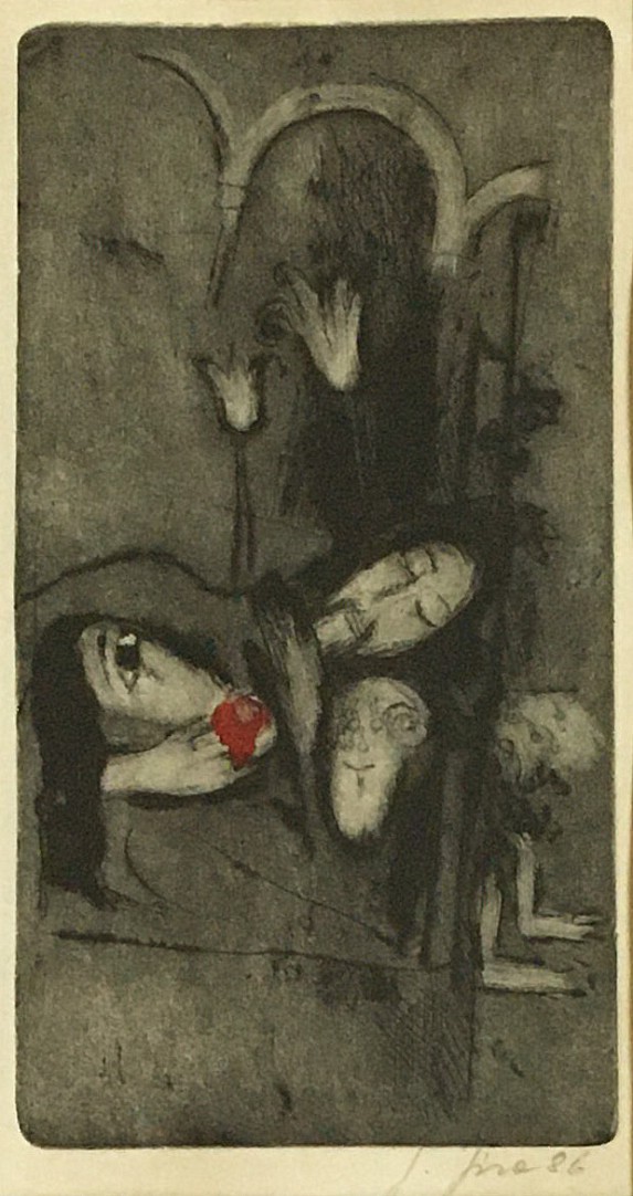 suchá jehla, 1986, 19 x 10,3 cm, sign. PD J. Jíra 86, rám, žák prof. K. Mináře, M. Holého, O. Nejedlého a V. Rady na AVU v Praze, spoluzakladatel skupiny M 57, člen Nové skupiny