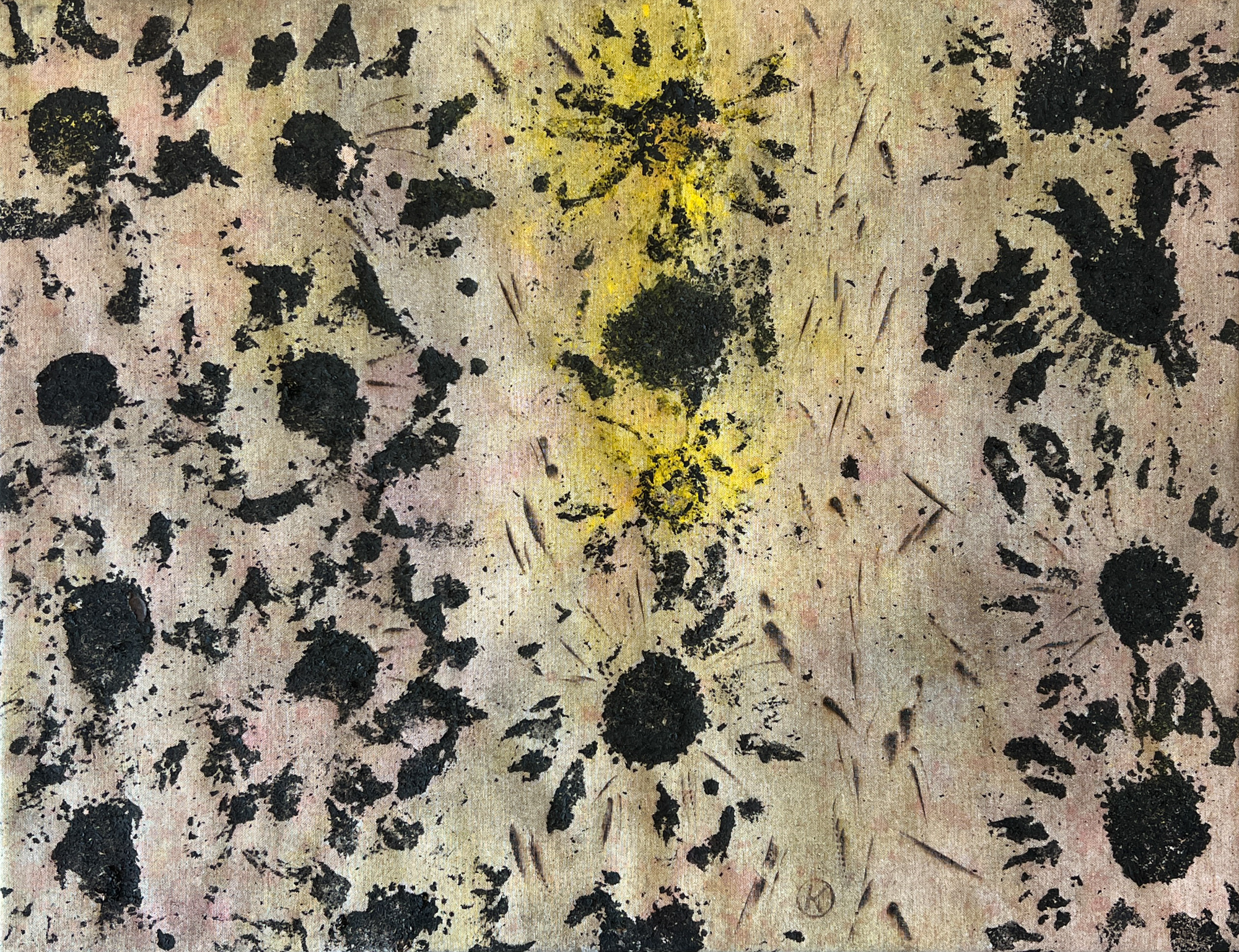 plátno, oheň, popel, akryl, 2022, 50 x 65 cm, sign. PD K, Svatopluk Klimeš je český výtvarník, jehož tvorba se vyznačuje experimentálním přístupem a hlubokým propojením s přírodními živly. Od šedesátých let 20. století využívá v malbě a kresbě oheň a popel, čímž tematizuje pomíjivost, destrukci a zá…