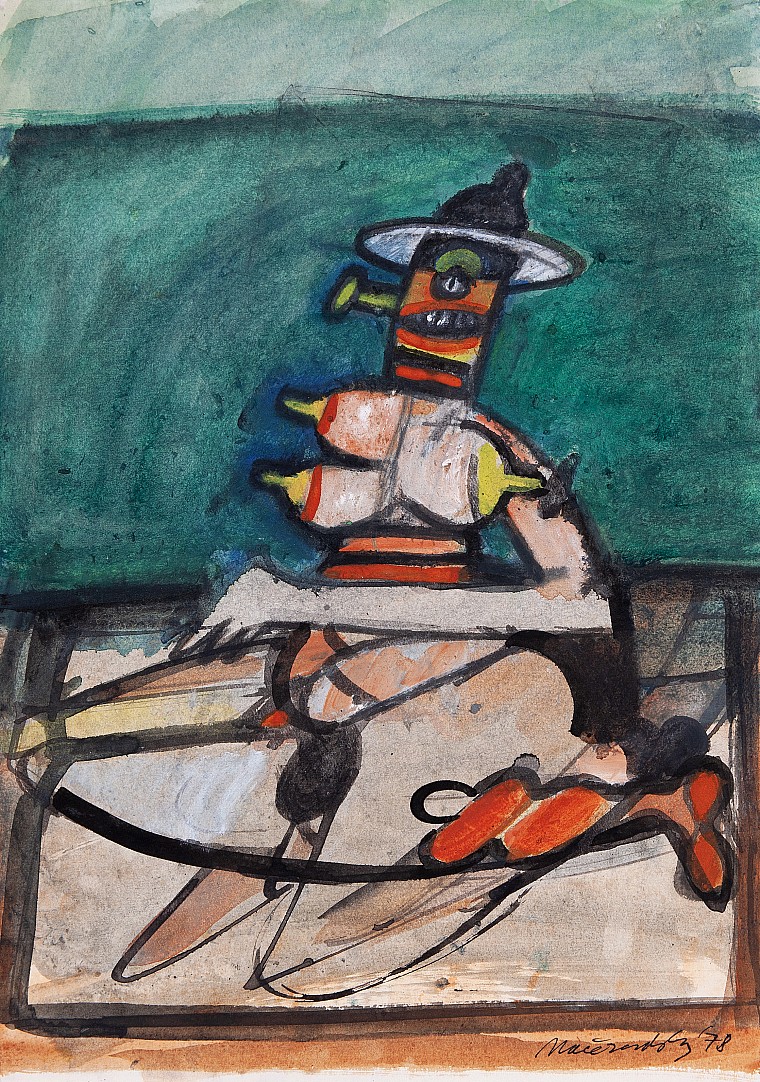 tempera, kvaš, uhel, kombinovaná technika, papír, 1967, 34,5 x 49,5 cm, sign. PN Načeradský, rám, posouzeno kurátorem a správcem umělecké pozůstalosti autora Petrem Machem, hravá ukázka z díla jednoho z vůdčích představitelů Nové figurace a České grotesky. Načeradský vystudoval Akademii výtvarných u…