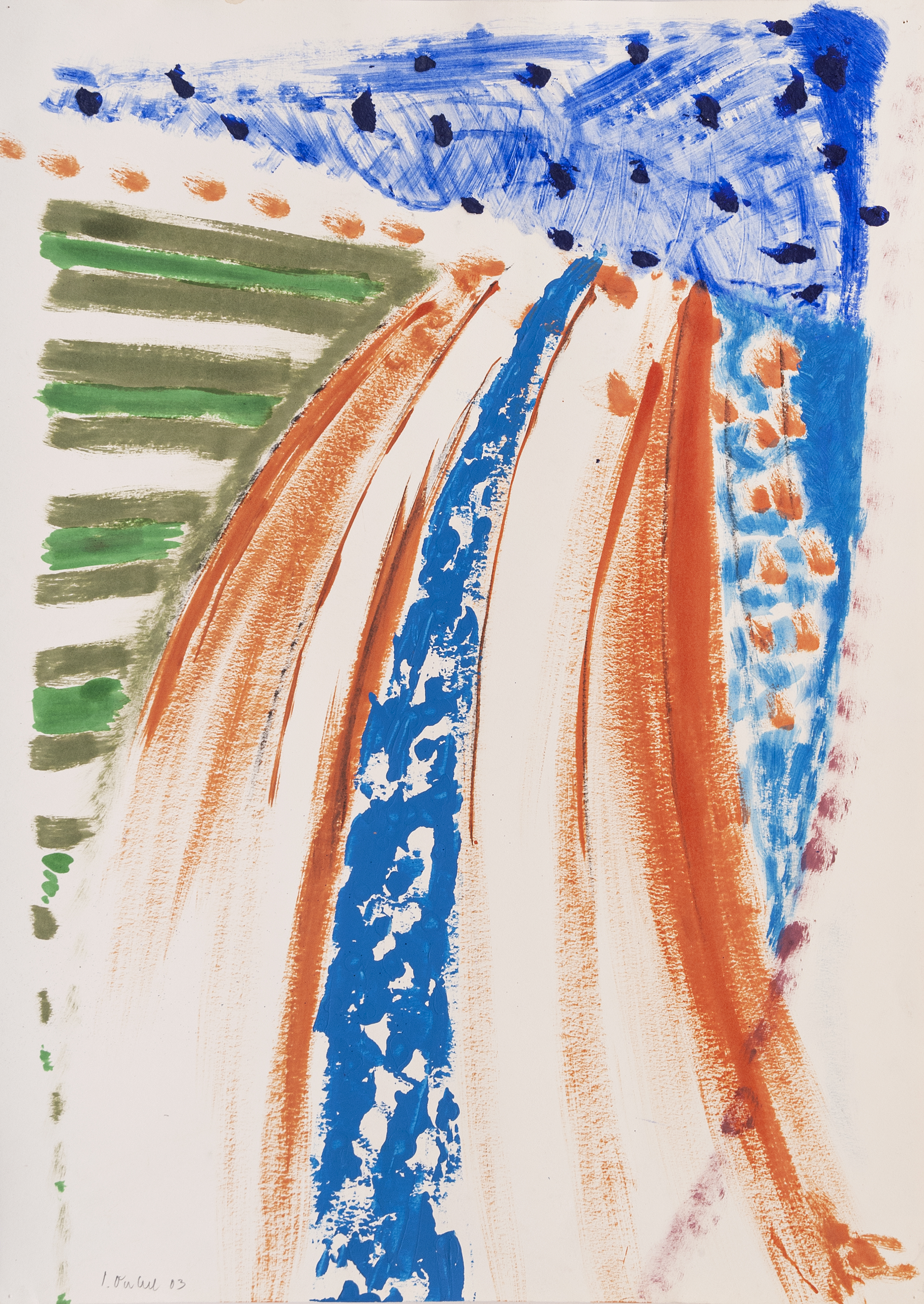 olej, akvarel, tužší papír, 2003, 70,5 x 50,5 cm, sign. LD I. Ouhel 03, tato kombinovaná technika v redukovaném tvarosloví je dílem významného představitele moderní české krajinomalby, který zcela osobitě rozvíjel odkazy malířského díla Josefa Šímy, Jiřího Johna a Karla Valtra. Ouhel dvakrát repreze…
