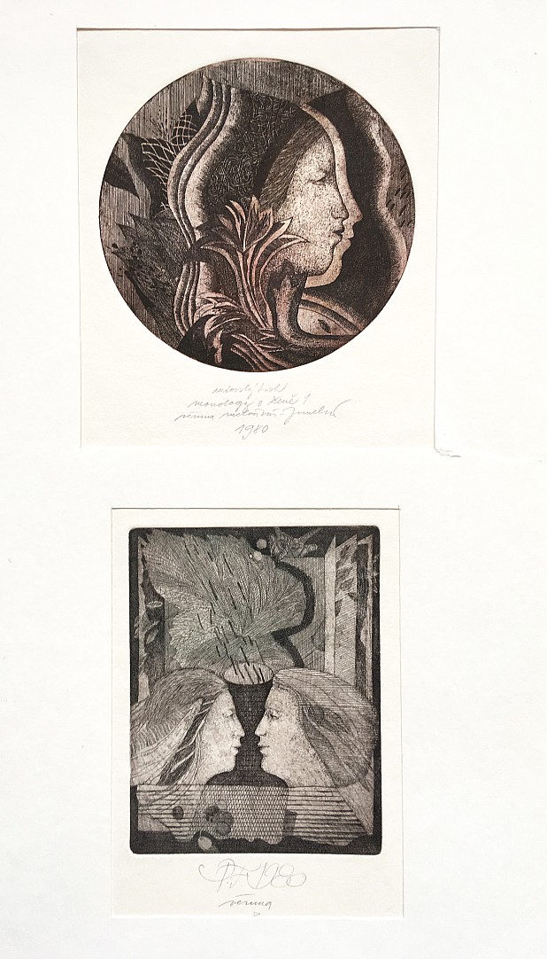 2x lept, 1980, 11,5 x 11,5; 12 x 9,5 cm, sign. DU Věruna Melčáková Juneková
