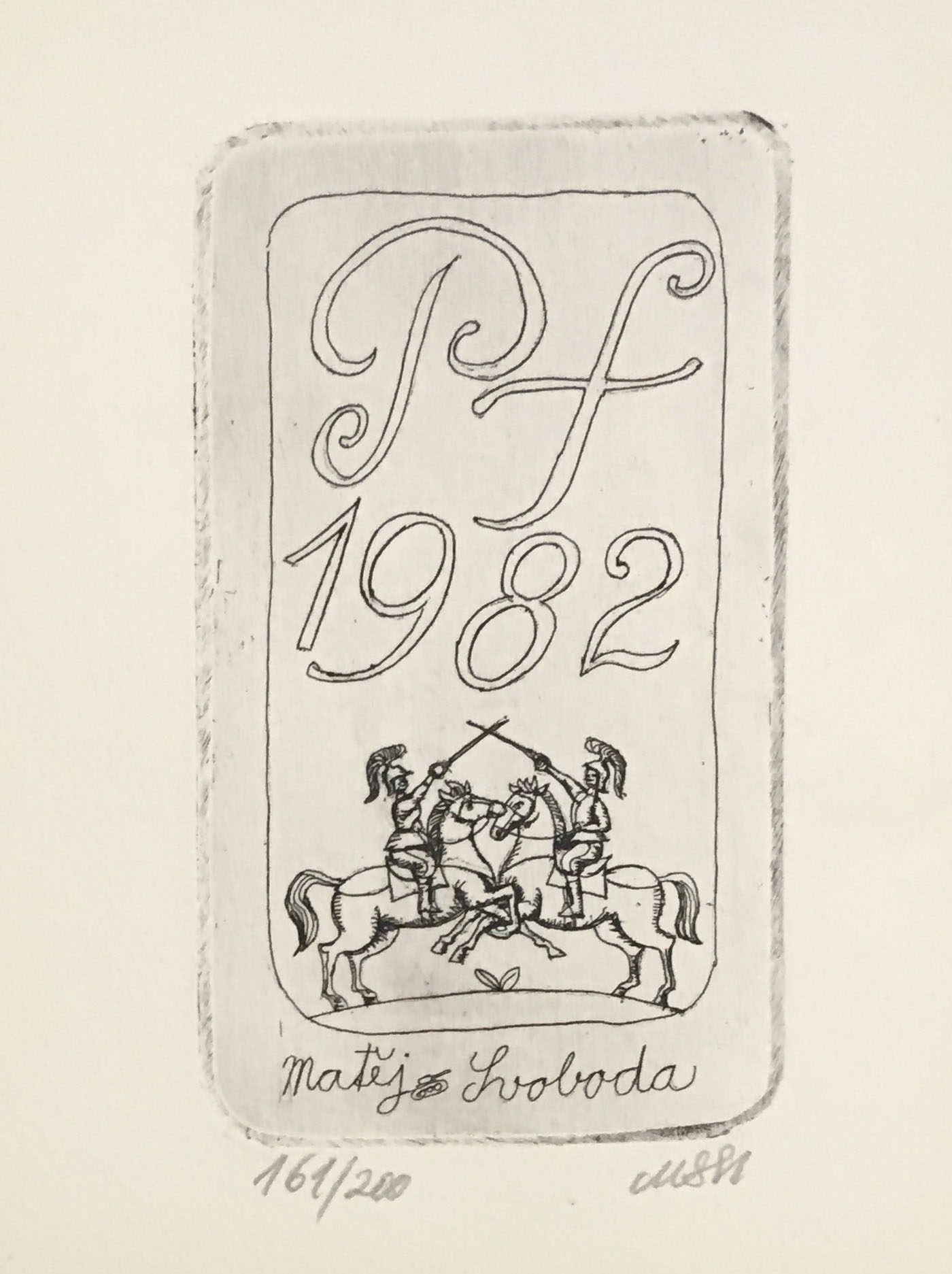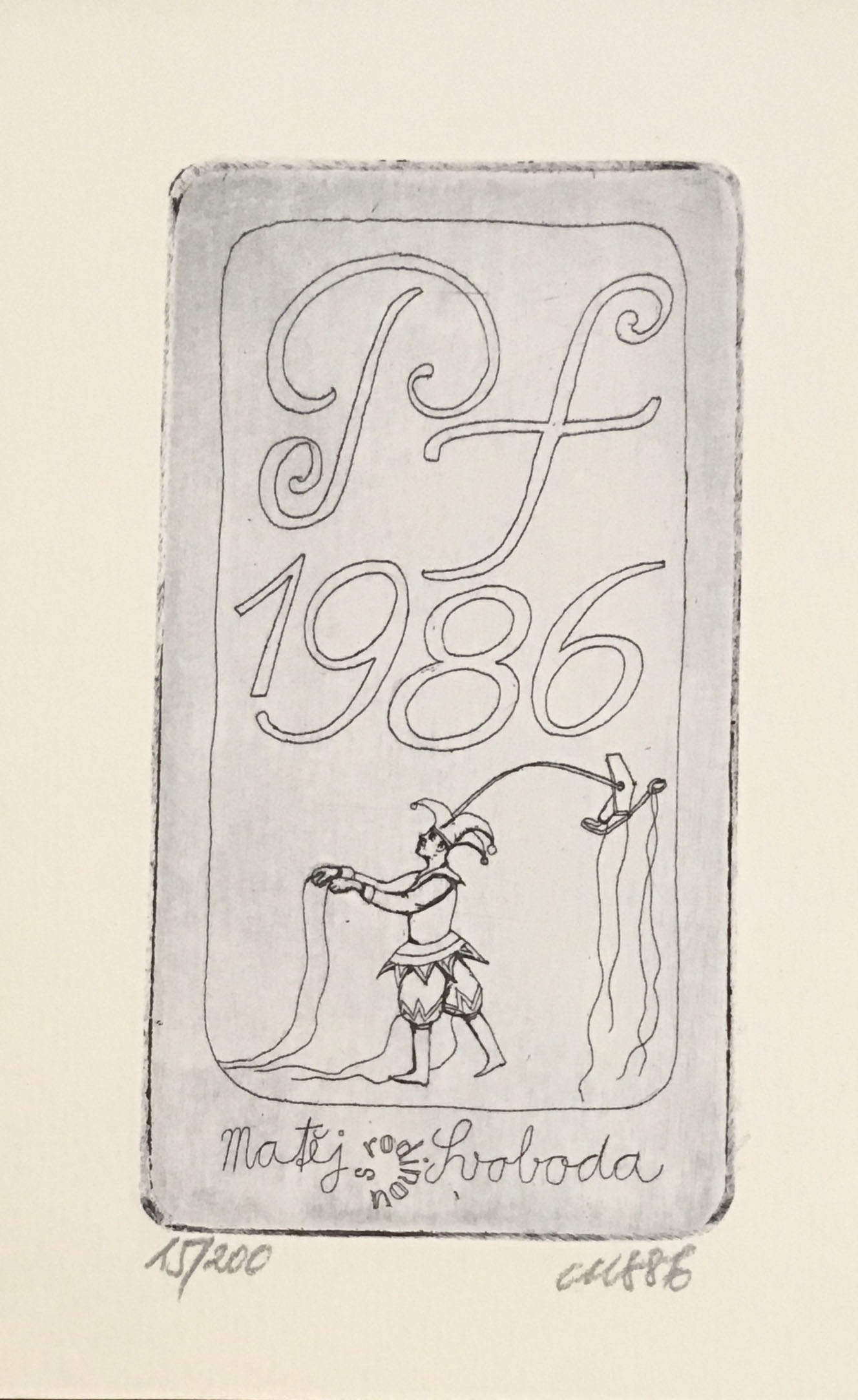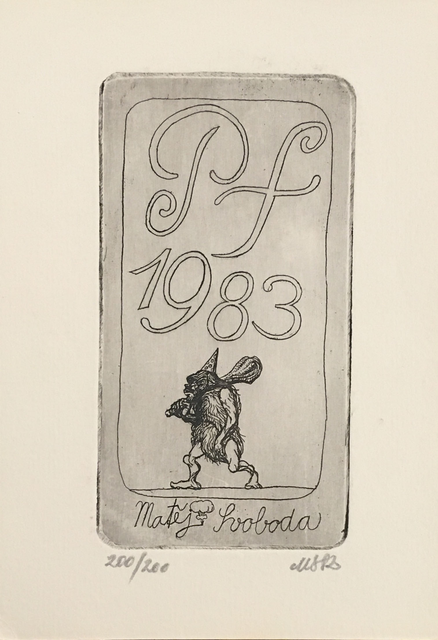 lept, 1985, 20 x 13 cm, sign. PD Matěj Svoboda 85, a. t. , žák prof. V. Tittelbacha a L. Čepeláka na AVU v Praze, člen UVU, zakladatel skupiny 68 pod plachtou a skupiny Tolerance, předseda Asociace volné grafiky