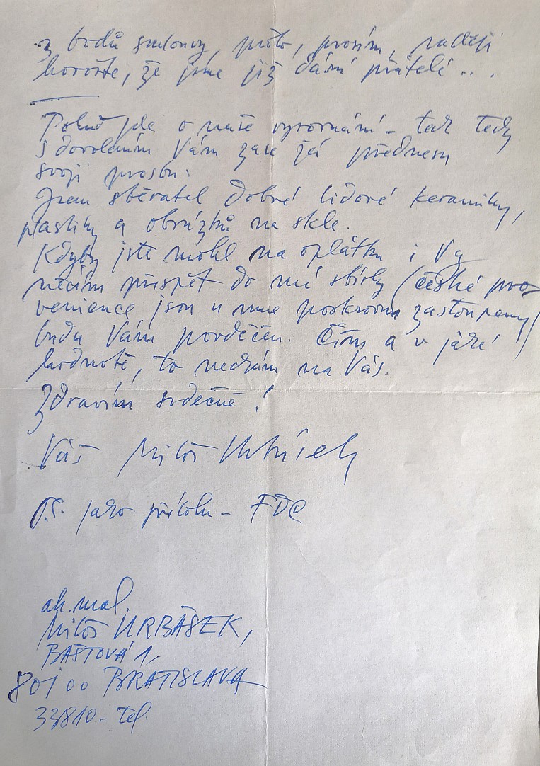 dopis, 29,5 x 19 cm, studium u prof. P. Matejky a V. Hložníka na VŠVU v Bratislavě, člen Klubu grafiků a skupiny Kontrast
