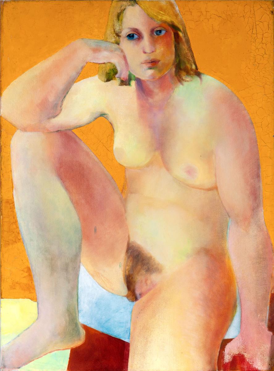 olej, plátno, 76 x 55,5 cm, figurální malba s námětem sedícího ženského aktu. Umělec ztvárnil model v kontrastu s jasně oranžovým pozadím, tělo je modelováno jemnými barevnými přechody s pastelovými tóny růžové, modré a zelené. Dílo nese znaky české nové figurace 70.–80. let 20. století, s důrazem n…