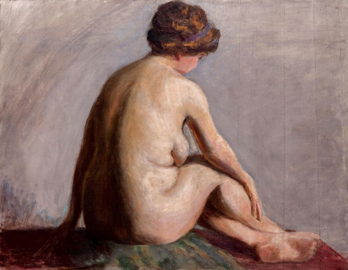 olej, plátno, 50 x 64 cm, malba ženského aktu v tradičním pojetí, soustředěná na jemné modelování těla, hru světla a přirozený výraz figury. Kompozice působí klidně a vyváženě, s důrazem na anatomickou věrnost a harmonii barevných tónů. Stylové znaky naznačují akademické školení a vztah k malířské t…
