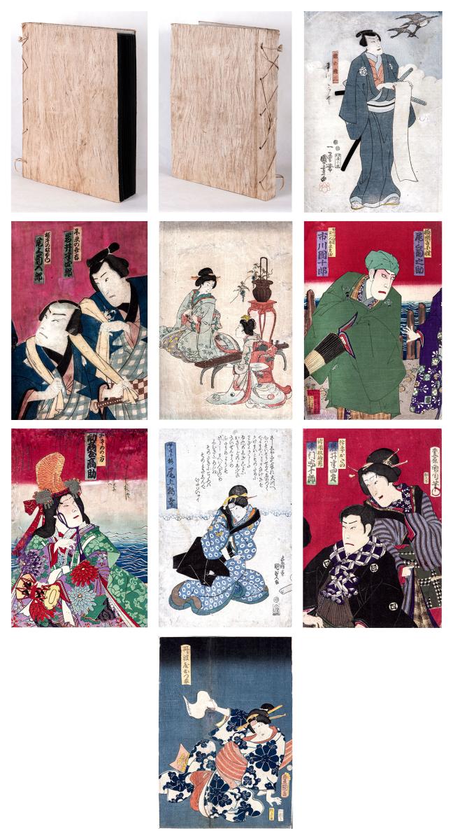 japonský dřevoryt, 34 x 23 cm, soubor 41 originálních japonských dřevorytů z období 19. století představuje ukázku klasické ukiyo-e tvorby od předních představitelů školy Utagawa. Mezi zastoupenými autory figurují významná jména jako Kunisada Utagawa, Kunichika Toyohara, Chikanobu Toyohara, Kuniyosh…