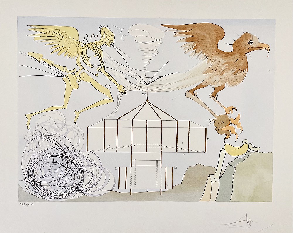 suchá jehla, lept, pochoir, 1975, 36 x 50 cm, sign. PD Dalí, rám, č. 183/450, významný katalánský malíř s osobitým rukopisem byl v roce 1929, po spolupráci na Buñuelově snímku Andaluský pes, přijat do skupiny pařížských surrealistů. Nevázaný umělec, který toužil po zviditelnění a po penězích a nezdr…