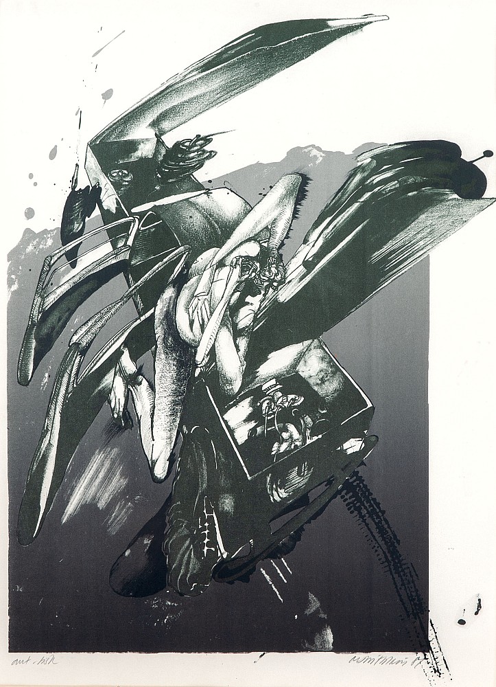 litografie, 1981, 46 x 35 cm, sign. PD Michael Rittstein 81, pasparta, autorský tisk, Antiqari.at Radhošťská, antiqari.at Radhošťská, studium na SOŠV v Praze, žák prof. A. Paderlíka na AVU tamtéž, spoluzakladatel Volného seskupení 12/15, Pozdě, ale přece, člen uměleckého sdružení Nová skupina a SVU …