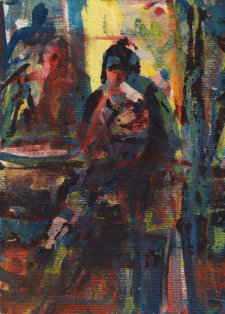 tempera, lepenka, 21,2 x 17,4 cm, rám, Antikvariát Ostrovní, žák prof. A. Hofbauera, J. Bendy, J. Obrovského, člen Skupiny 42, Umělecké besedy, SČUG Hollar