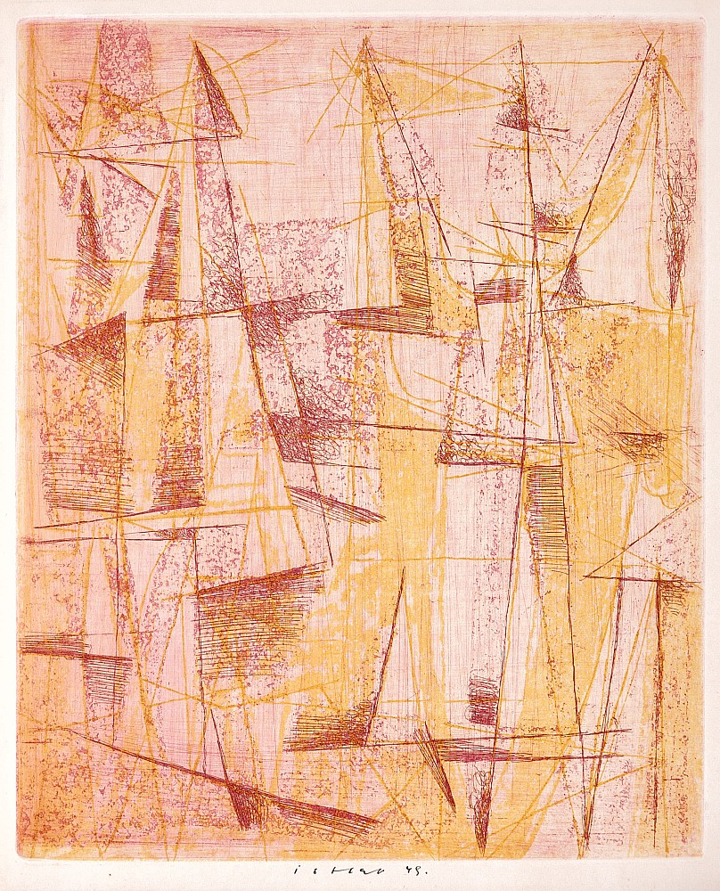 lept, 1945, 27 x 22,5 cm, sign. PD istler 45, č. 1/4, žák německého malíře Waltera Höfnera, člen skupiny Cobra (Belgie a Francie), člen surrealistické Skupiny RA, SČUG Hollar a Společnosti K. Teiga