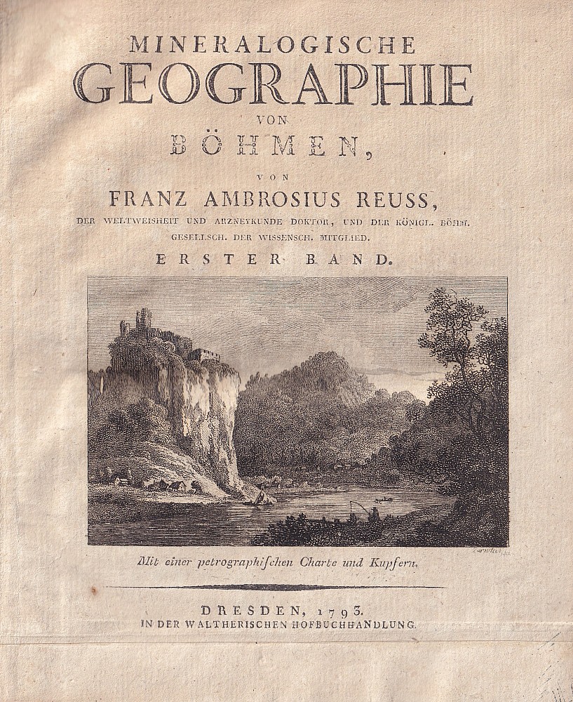 kniha, významné rané vědecké dílo z oblasti mineralogie a geologie, obs. pět mědirytinových vedut (hrad Střekov, Doubravku u Teplic, krajinu u Hřenska, skalní útvar u Ústí nad Labem a Hrad Hazmburk) a 1x rozkládací petrografickou mapu z Litoměřického kraje; vyd. Waltherischen Hofbuchhandlung, Dresde…