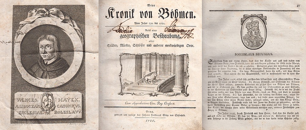 kniha, německy sepsaná historie česká, jde o předchůdce čtyřdílné Pelclovy Nowé Kronyky Cžeské, portrét kronikáře Václava Hájka z Libočan mědirytem ve frontispisu, alegorické vyobr. českého lva mědirytem v titulu, do dřeva ryté idealizované portréty českých panovníků v kartuších od Kroka až po Marii…