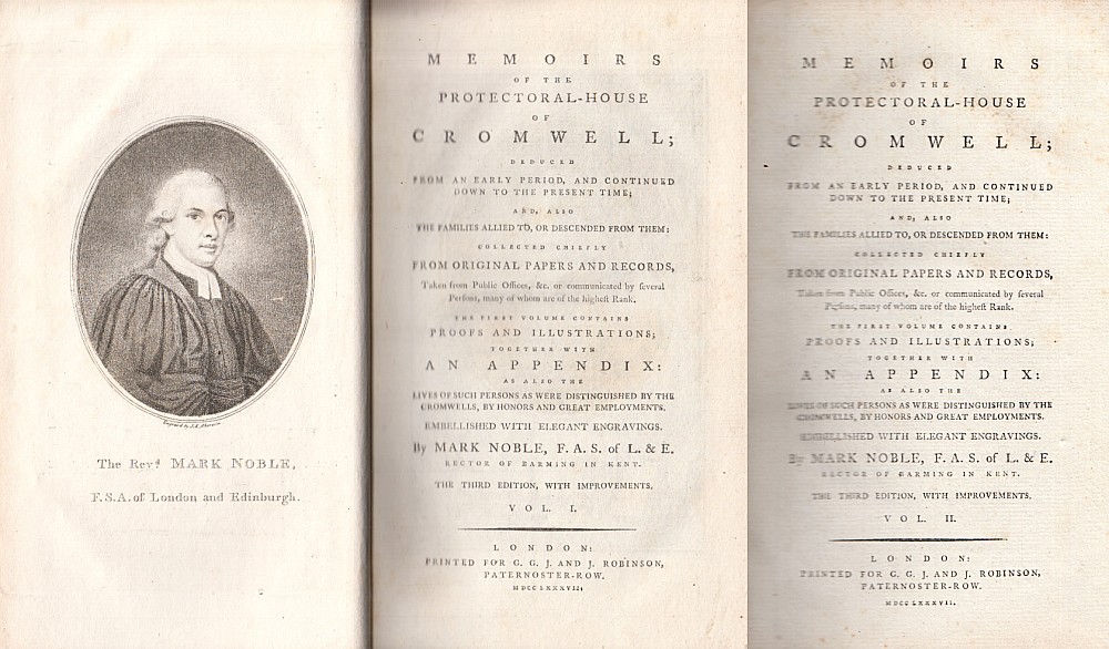 kniha, dvousvazkové dějiny rodu lorda protektora Olivera Cromwella, portrét autora ve frontispisu, dedikační výjev za titulem, rozkládací genealogické, heraldické a vexilologické stromy, faksimile listin, portréty členů Cromwellovy rodiny, sídla, vše mědirytem, marginálie, záhlaví, anglický text, vy…