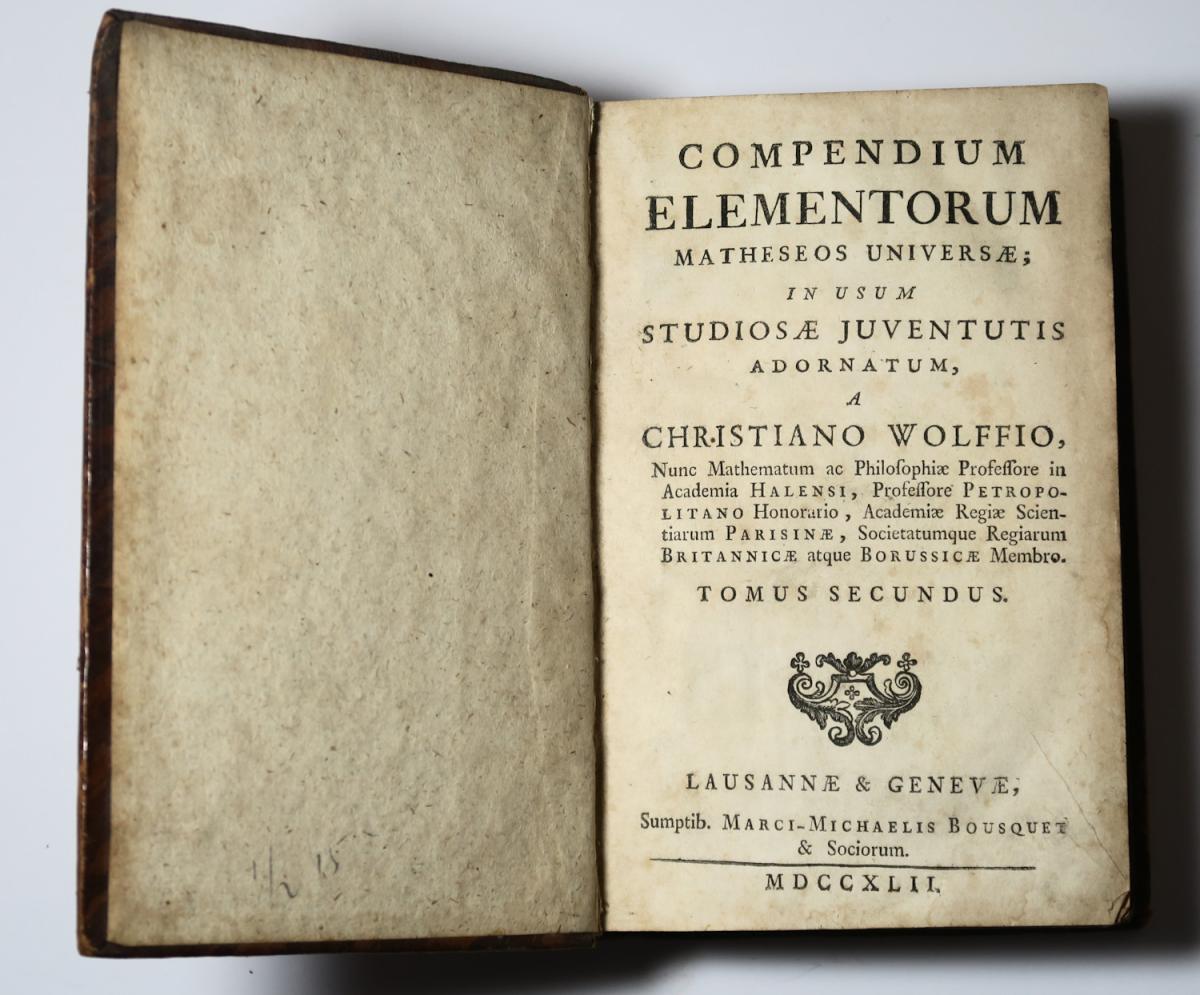 starý tisk, druhý svazek Souhrnu základů všeobecné matematiky významného německého matematika a filozofa Christaina Wolffa je zaměřen na praktické využití matematiky v přírodních vědách, zejména v astronomii, geografii, pyrotechniku a vojenské stavitelství, civilní architekturu a závěr je věnován al…