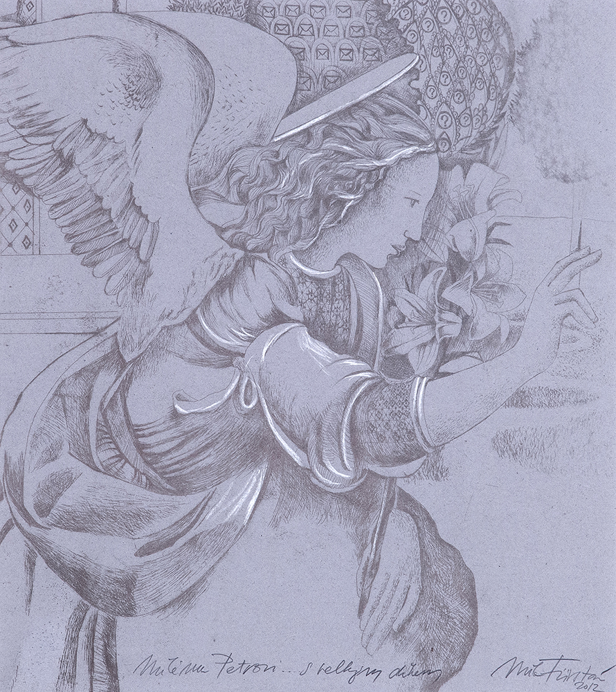 lept, 2012, 44,5 x 39,5 cm, sign. PD Míla Fürstová 2012, rám, grafika vznikla v rámci spolupráce s britskou kapelou Coldplay na obalu alba Ghost Stories, Antikvariát Dlážděná