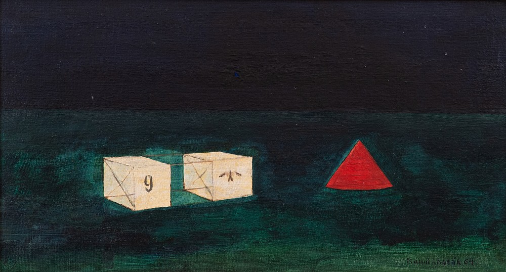 olej, plátno, podlepeno, 1964, 23 x 42 cm, sign. LD Kamil Lhoták 64, rám, vzadu napsán název autorem Drak a Jehlan, zatím co v soupise díla uvedeno pod názvem: Plátěný drak a červený trojboký jehlan. Dílo významného českého malíře, grafika a ilustrátora, člena Skupiny 42, jenž patří mezi nejznámější…