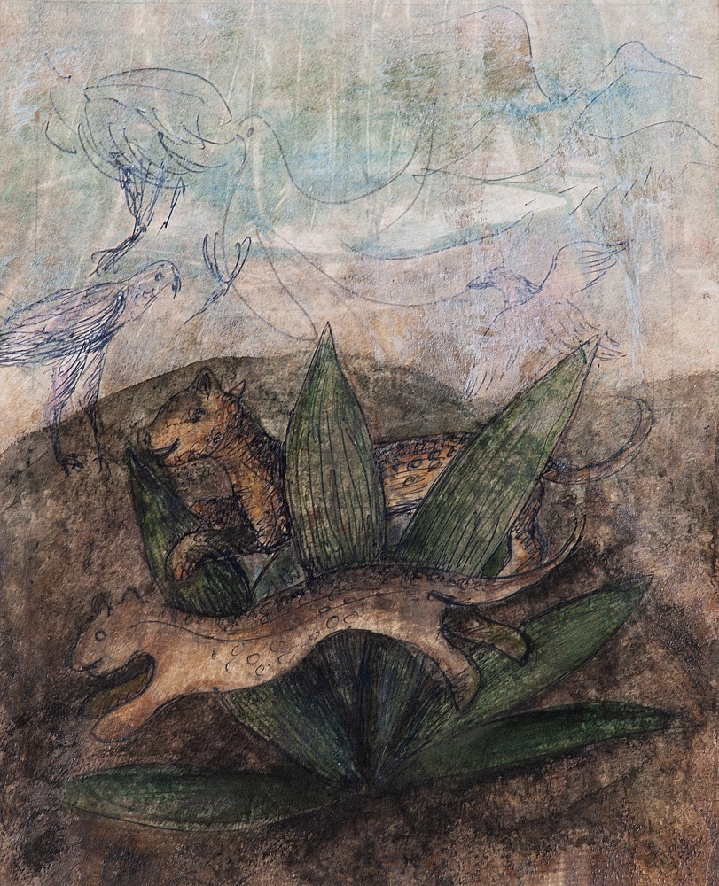 kombinovaná technika, tuš, olej, karton, 25,5 x 20,5 cm, rám, vzadu rukopisný přípis: Z pozůstalosti St. Podhrázského, Jar. Podhrázská 2010; součástí položky je monografie Stanislava Podhrázkého, kde je nabízená položka uvedena, the disciple of prof. F. Tichy, member of the group Maj