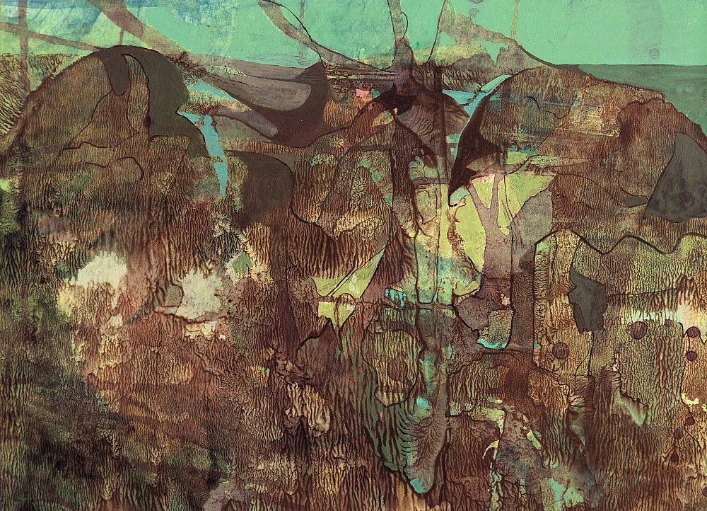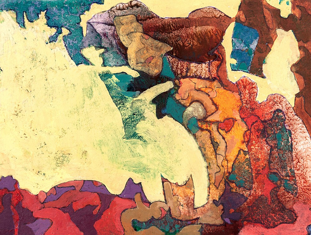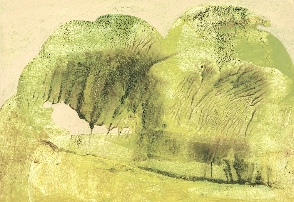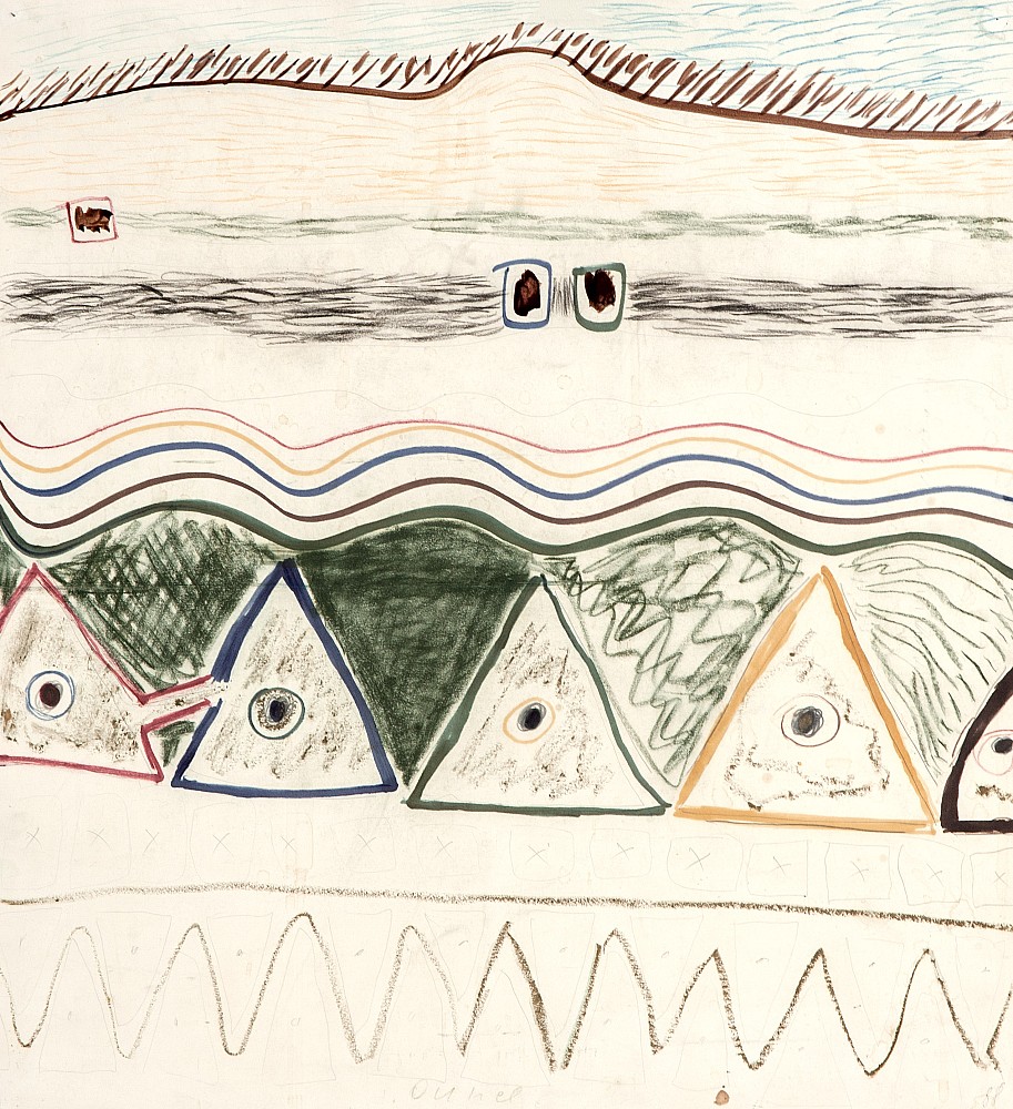 tempera, pastel, papír, 1988, 54,5 x 50 cm, sign. DU Ouhel, tato kombinovaná technika ze sběratelsky ceněných osmdesátých let je dílem významného představitele moderní české krajinomalby, který zcela osobitě rozvíjel odkazy malířského díla Josefa Šímy, Jiřího Johna a Karla Valtra. Ouhel dvakrát repr…