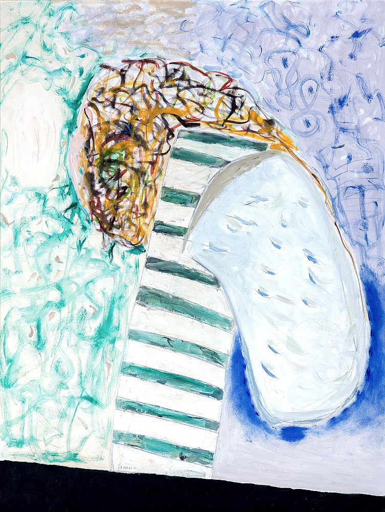 olej, plátno, 1990, 130 x 100 cm, sign. LD I. Ouhel 90, rám, vzadu štítek Galerie Gema, DU protržené plátno cca 1,5 cm, the disciple of prof. Soucek, member of Volne seskupeni 12/15, Still even late, member of The Umelecka beseda