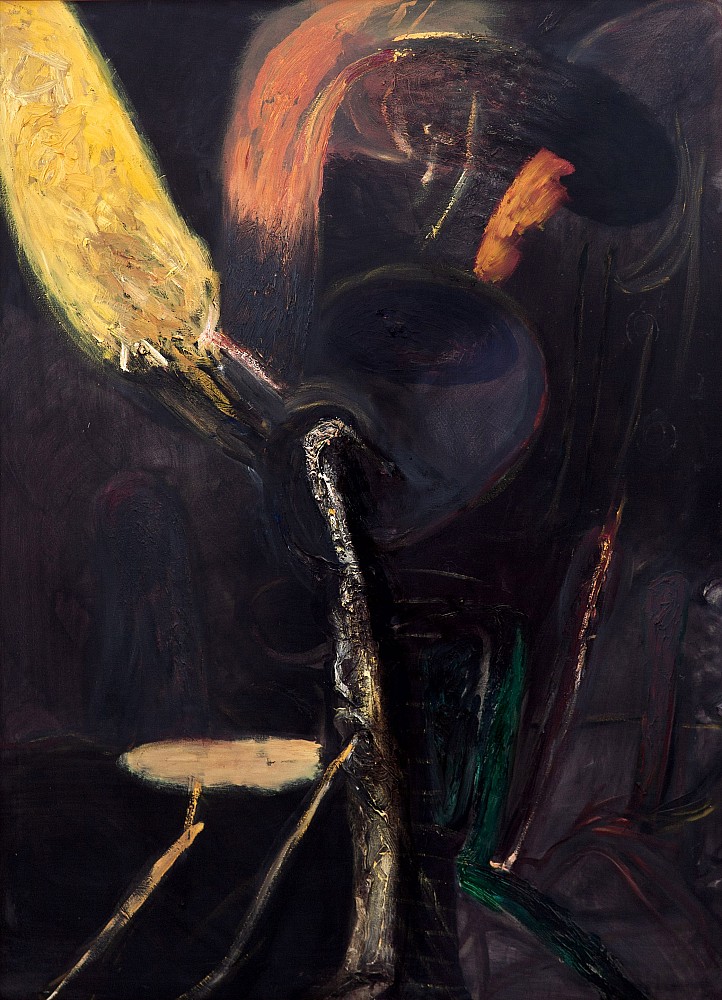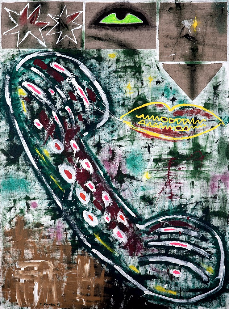 akryl, plátno, 1993, 200 x 147 cm, sign. LD R. Konvička 93, lišta, vzadu štítek Galerie Gema, známý malíř s expresivním výrazem, jehož tvorba se zdá na první pohled abstraktní, ale má reálný základ v lidské figuře či v prvcích běžných předmětů.