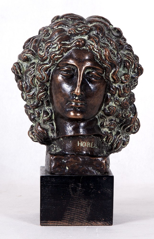patinovaný bronz, opuka, 1923, 18,5 x 13 x 13 cm, sign. Horejc, bronzová plastika je mistrovskou ukázkou Horejcova sochařství ve stylu art deco, v němž se syntetizuje inspirace antickou a archaickou plastikou s dobovou stylizací. Portrét biblické hrdinky je pojat s důrazem na kresebnou linii a deko…