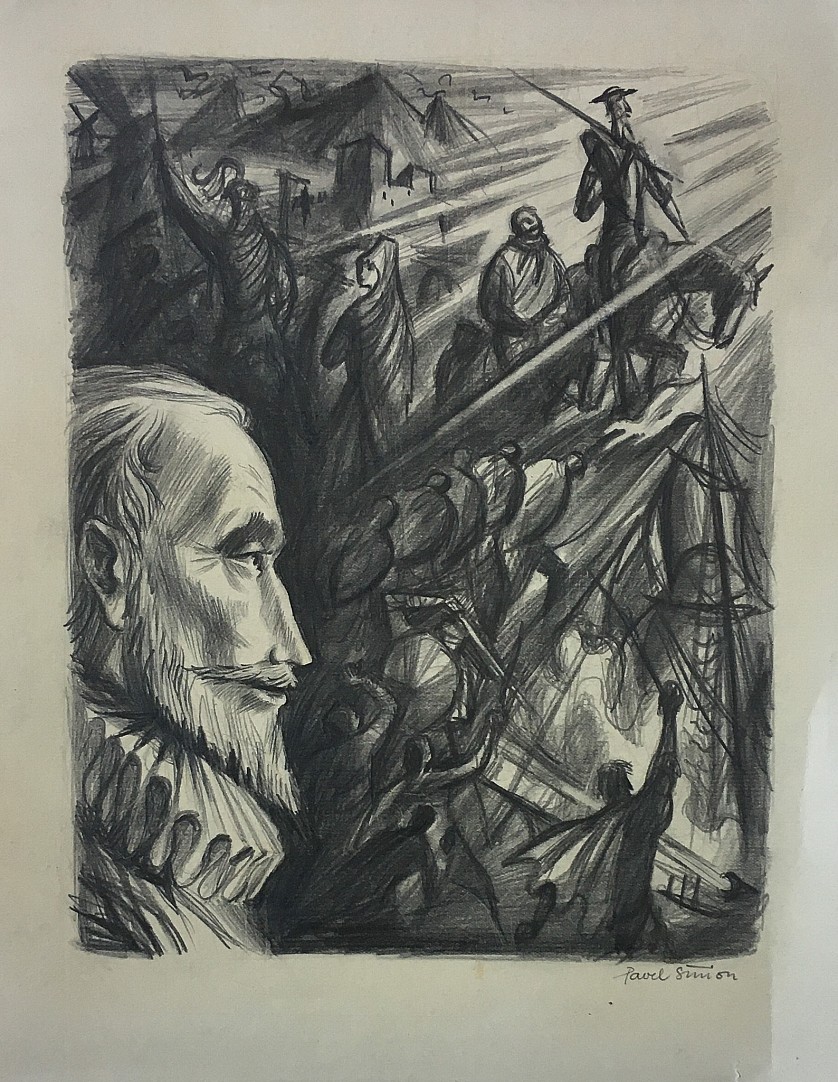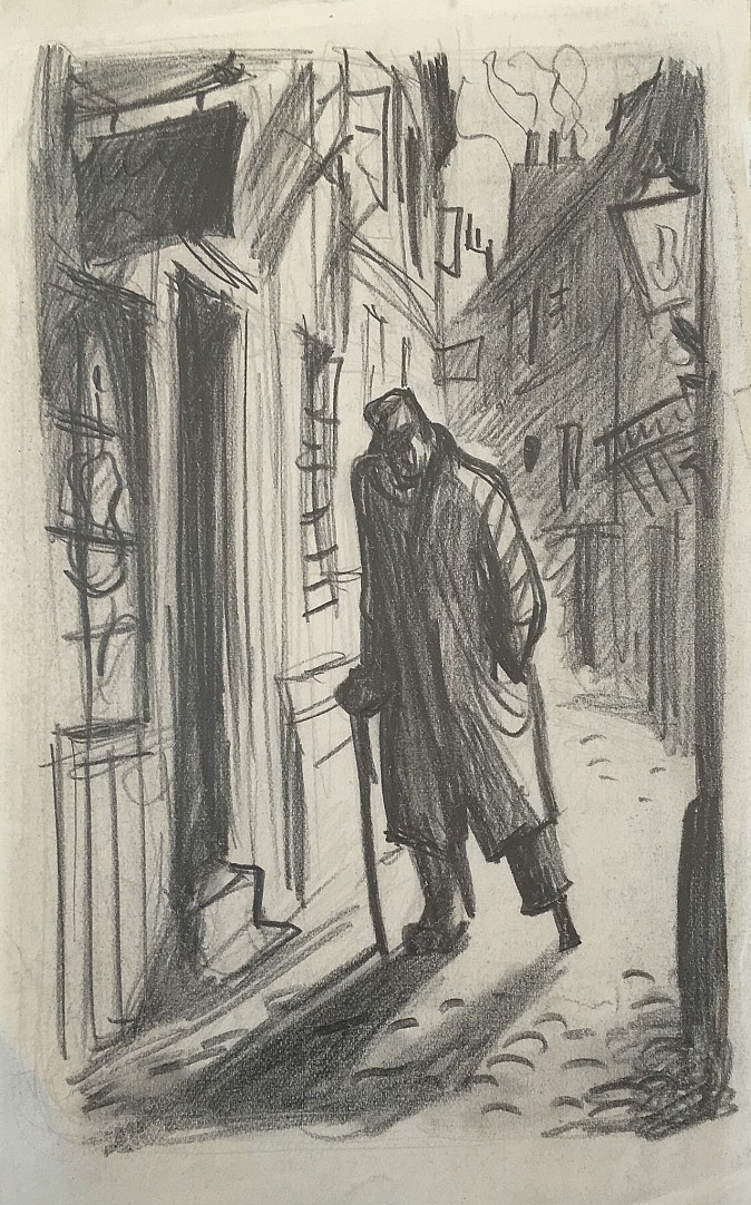 tužka, pero, papír, 22 x 15,7 cm, žák prof. V. Pukla, F. T. Šimona a A. Pelce na AVU v Praze, člen SČUG Hollar