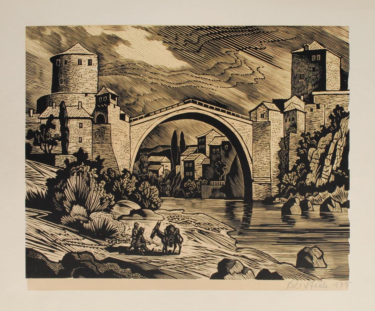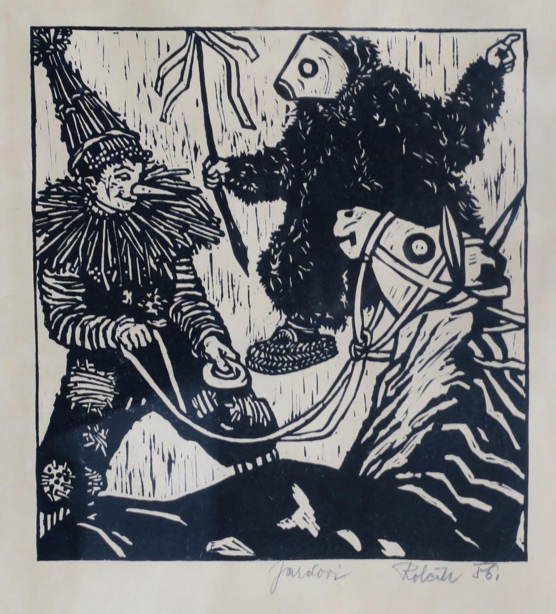 dřevoryt, 1956, 20,5 x 19 cm, sign. PD Rolčík 56, rám, zažloutlý papír, Antikvariát Ostrovní, studium na Škole umění ve Zlíně, žák prof. J. Baucha a A. Pelce na VŠUP v Praze