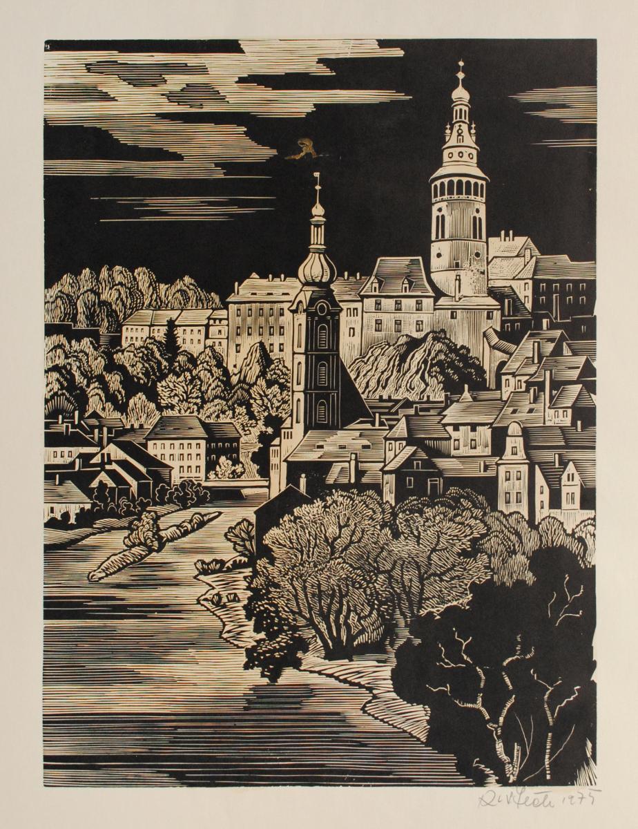 dřevoryt, 1975, 27,6 x 35 cm, sign. PD K. Štěch 1975, pravý horní a dolní levý roh papíru pokrčené, Antiqari.at Radhošťská, antiqari.at Radhošťská, studium grafiky u prof. Z. Kratochvíla na UMPRUM v Praze, žák prof. F. T. Šimona na AVU, člen SČUG Hollar, Sdružení jihočeských výtvarníků