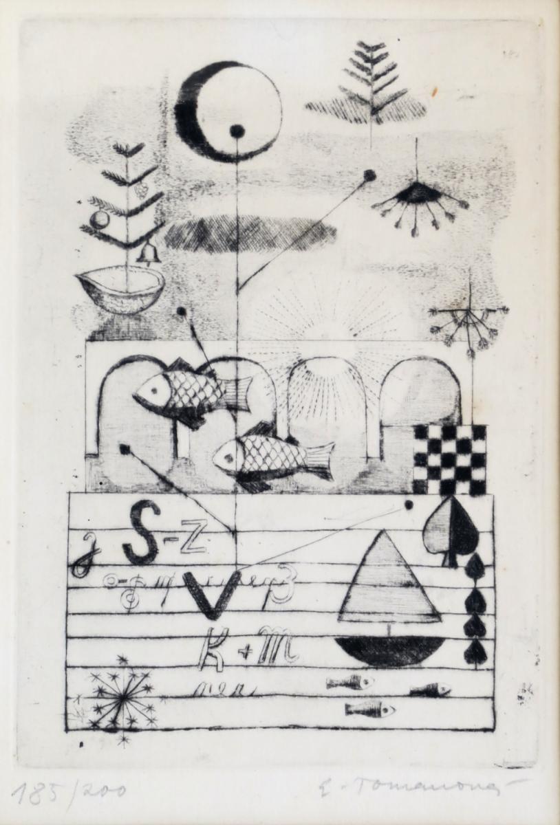 suchá jehla, 18,2 x 12,2 cm, sign. PD E. Tomanová, pasparta, č. 185/200, Antikvariát Ostrovní, studium u P. Dillingera a Z. Balaše na Státní grafické škole v Praze a grafické speciálky u prof. V. Pukla na AVU, členka SČUG Hollar