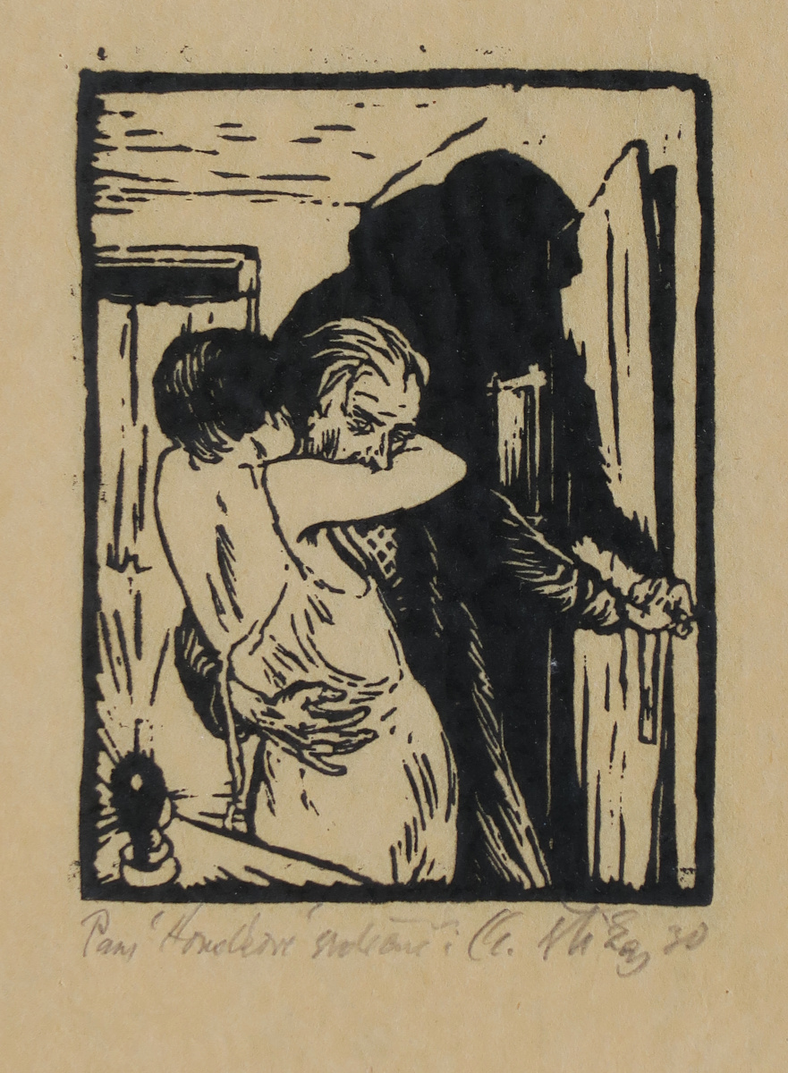 dřevoryt, 1930, 13,9 x 10,1 cm, sign. PD K. Štika 30, rám, zažloutlý papír, Antikvariát Ostrovní