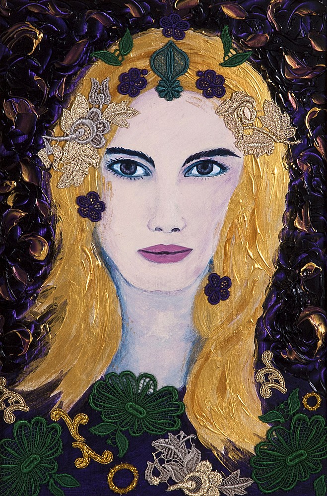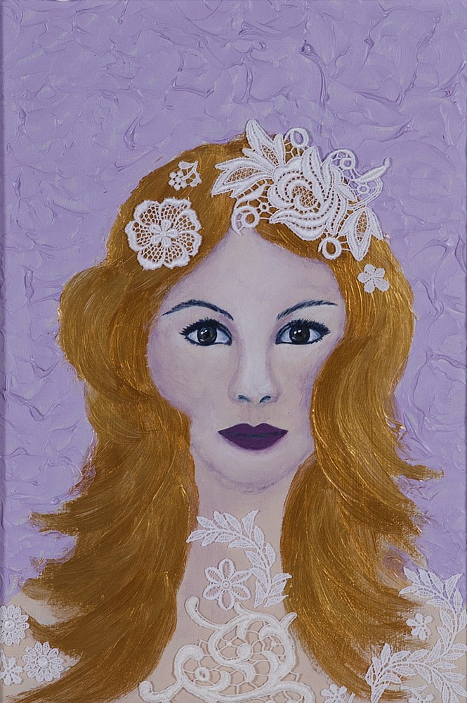 impasto technika (akryl), krajka, třpytky, sololit, 2020, 50 x 35 cm, monogr. na zadní straně AV 2020, rám, na zadní straně popsáno autorkou, Antikvariát Dlážděná