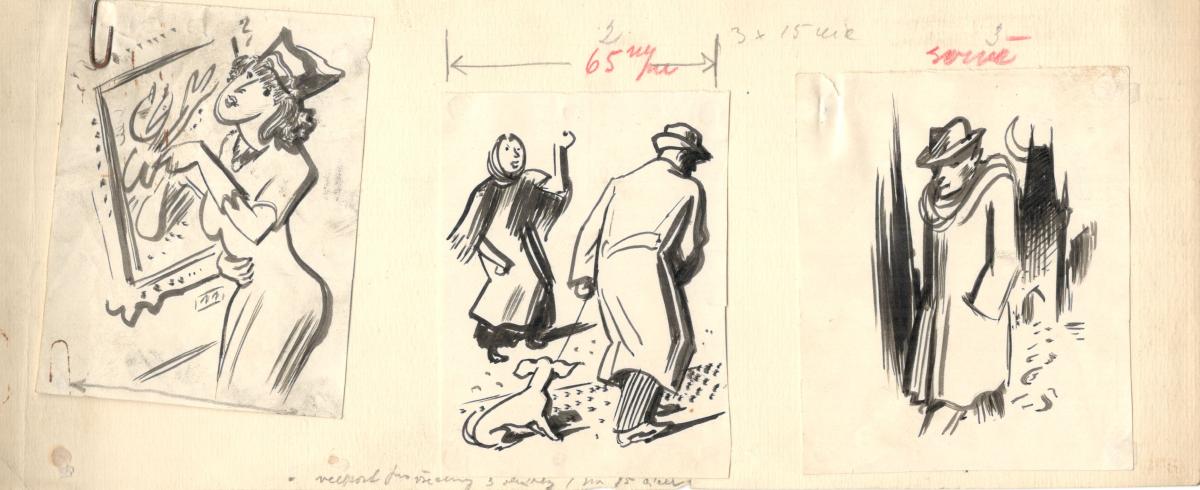 Žena v galerii / Na vycházce se psem / Procházka nocí (konvolut 3 kreseb)
