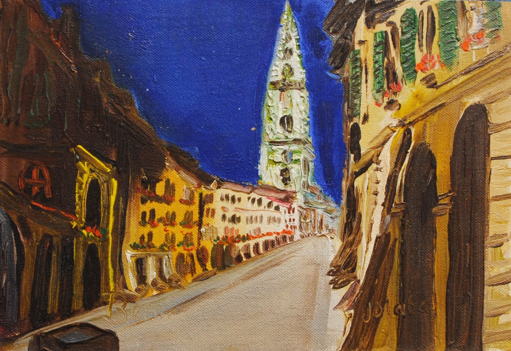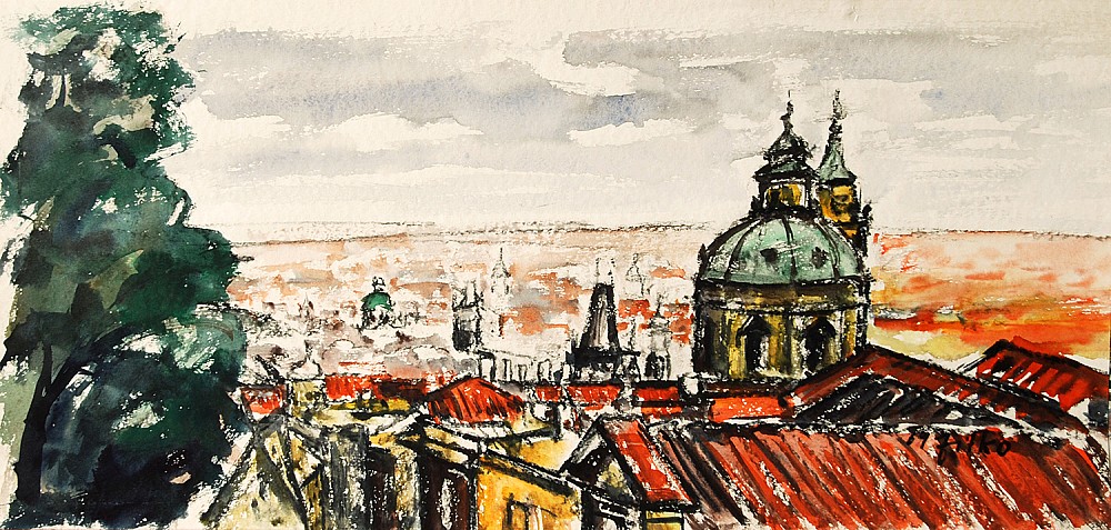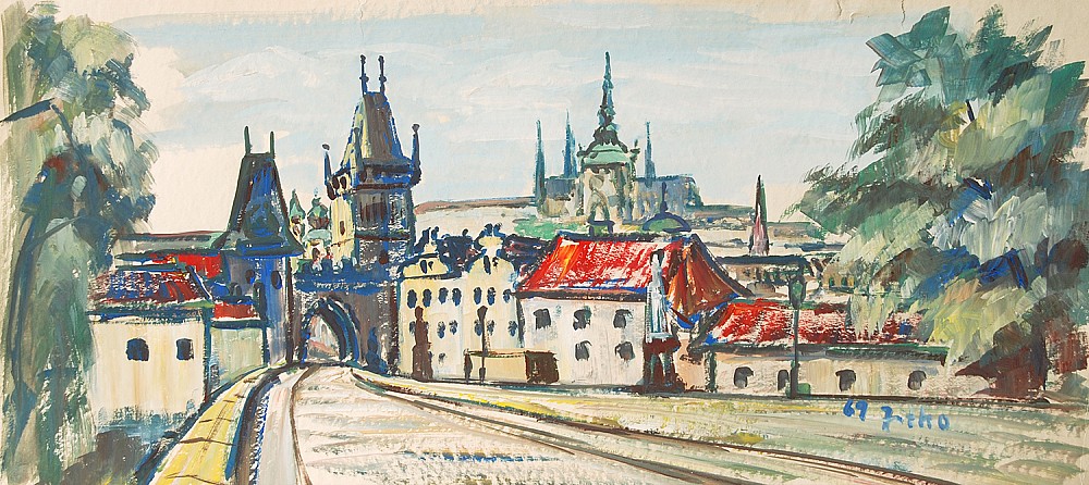 tempera, běloba, papír, 1969, 30,5 x 66 cm, sign. PD 69 Zítko , malíř staré Prahy a jeden z nejstarších a nejdéle působících výtvarníků Karlova mostu po roce 1968, působil zde více než 40 let, Antikvariát Dlážděná