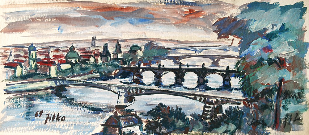tempera, akvarel, papír, 1969, 30 x 63 cm, sign. PD 69 Zítko , malíř staré Prahy a jeden z nejstarších a nejdéle působících výtvarníků Karlova mostu po roce 1968, působil zde více než 40 let, Antikvariát Dlážděná
